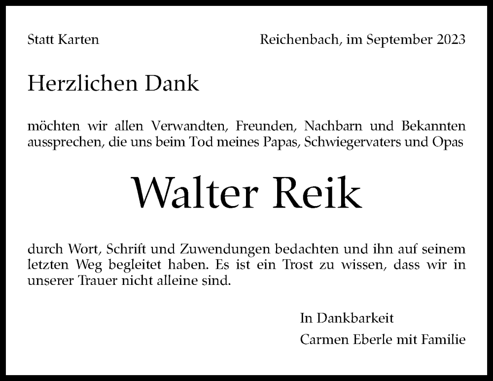 Hier finden Sie alle Traueranzeigen aus der Zeitung, die bisher für Walter Reik erschienen sind. Weitere Traueranzeigen, die in der Zeitung erscheinen, werden hier ebenfalls aufgelistet