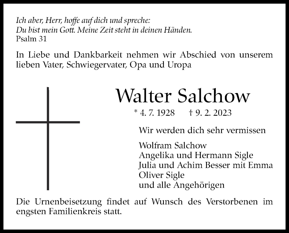 Hier finden Sie alle Traueranzeigen aus der Zeitung, die bisher für Walter Salchow erschienen sind. Weitere Traueranzeigen, die in der Zeitung erscheinen, werden hier ebenfalls aufgelistet