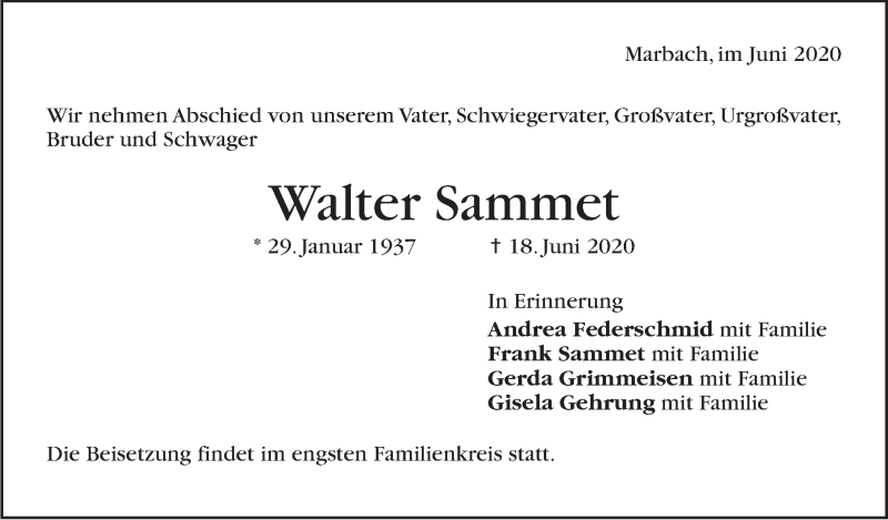 Hier finden Sie alle Traueranzeigen aus der Zeitung, die bisher für Walter Sammet erschienen sind. Weitere Traueranzeigen, die in der Zeitung erscheinen, werden hier ebenfalls aufgelistet