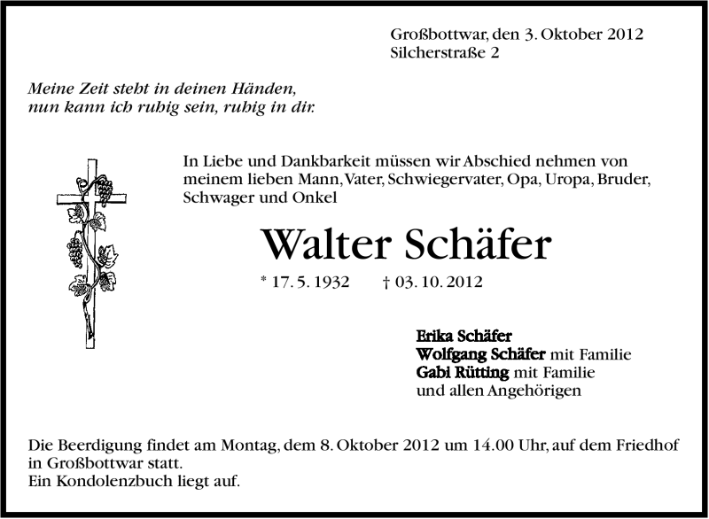 Hier finden Sie alle Traueranzeigen aus der Zeitung, die bisher für Walter Schäfer erschienen sind. Weitere Traueranzeigen, die in der Zeitung erscheinen, werden hier ebenfalls aufgelistet
