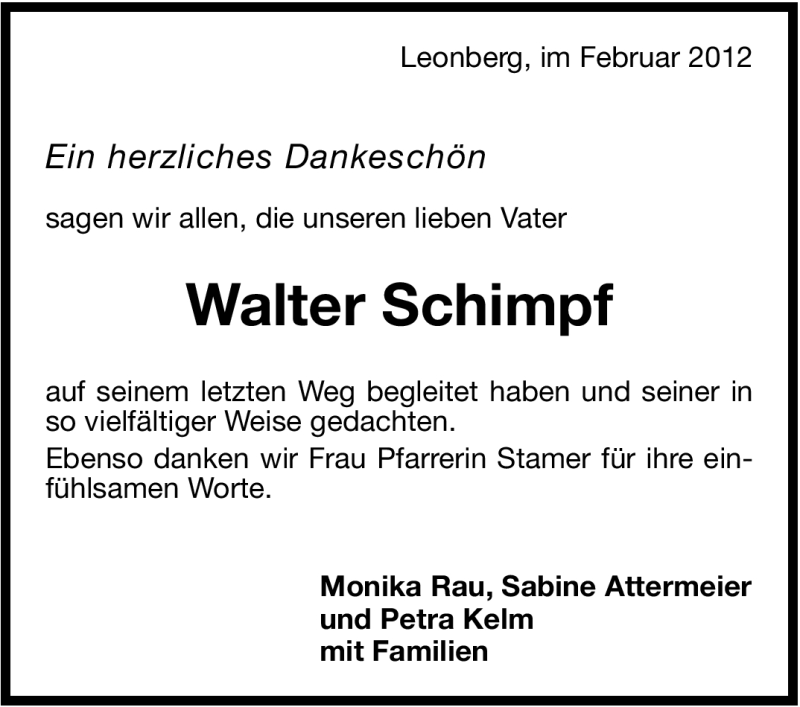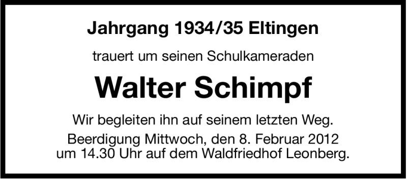 Hier finden Sie alle Traueranzeigen aus der Zeitung, die bisher für Walter Schimpf erschienen sind. Weitere Traueranzeigen, die in der Zeitung erscheinen, werden hier ebenfalls aufgelistet