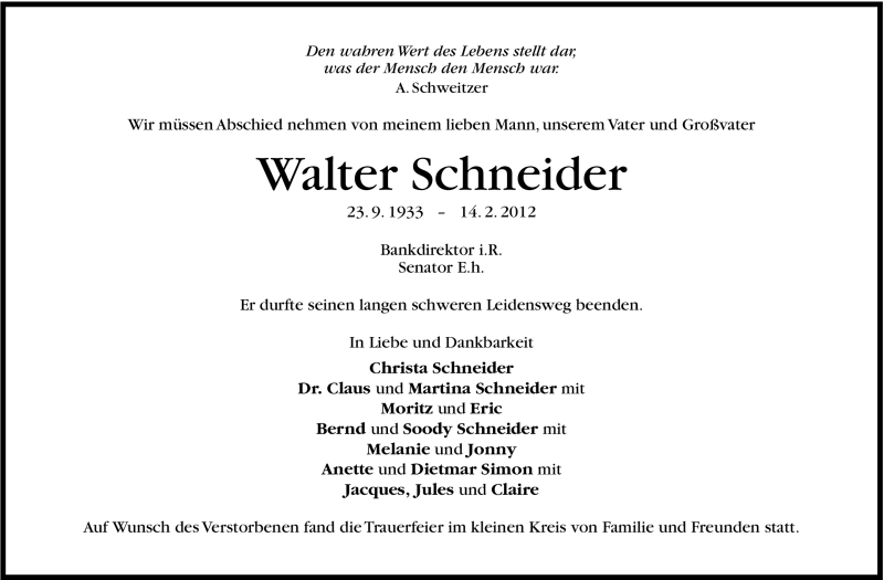 Hier finden Sie alle Traueranzeigen aus der Zeitung, die bisher für Walter Schneider erschienen sind. Weitere Traueranzeigen, die in der Zeitung erscheinen, werden hier ebenfalls aufgelistet