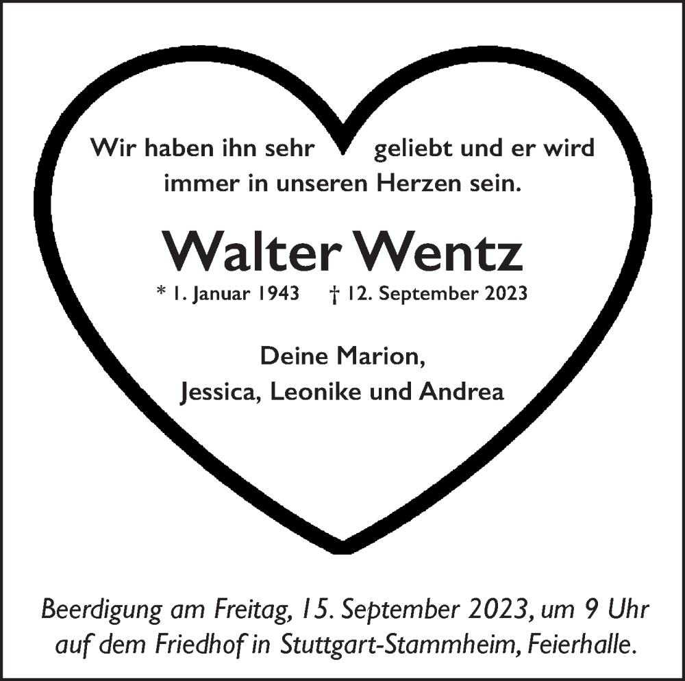 Hier finden Sie alle Traueranzeigen aus der Zeitung, die bisher für Walter Wentz erschienen sind. Weitere Traueranzeigen, die in der Zeitung erscheinen, werden hier ebenfalls aufgelistet