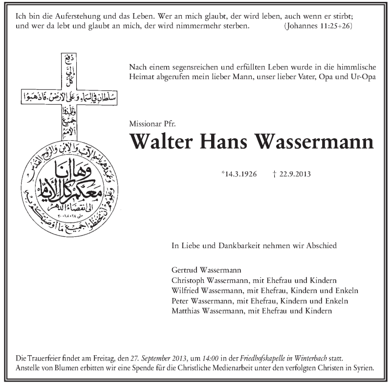 Hier finden Sie alle Traueranzeigen aus der Zeitung, die bisher für Walter Hans Wassermann erschienen sind. Weitere Traueranzeigen, die in der Zeitung erscheinen, werden hier ebenfalls aufgelistet