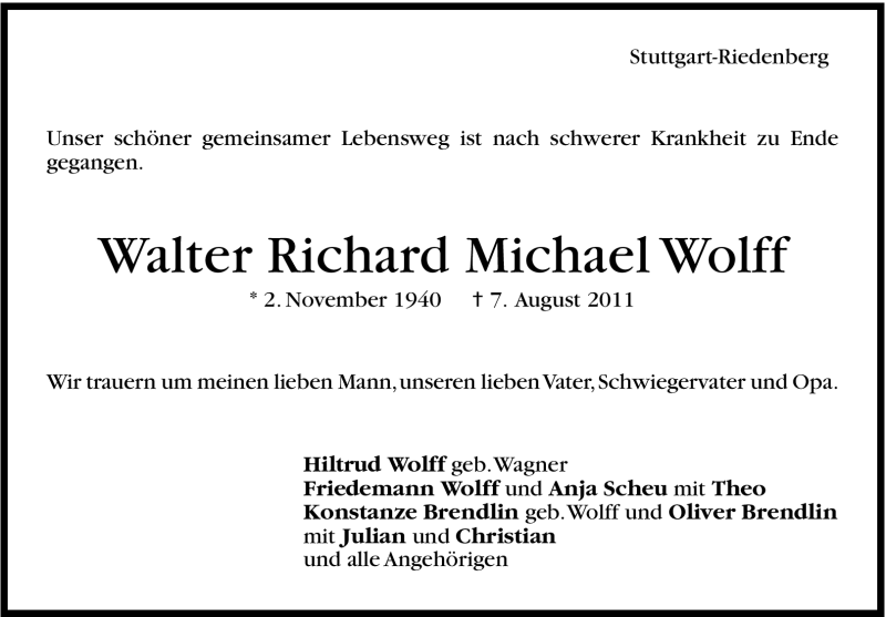 Hier finden Sie alle Traueranzeigen aus der Zeitung, die bisher für Walter Richard Michael Wolff erschienen sind. Weitere Traueranzeigen, die in der Zeitung erscheinen, werden hier ebenfalls aufgelistet