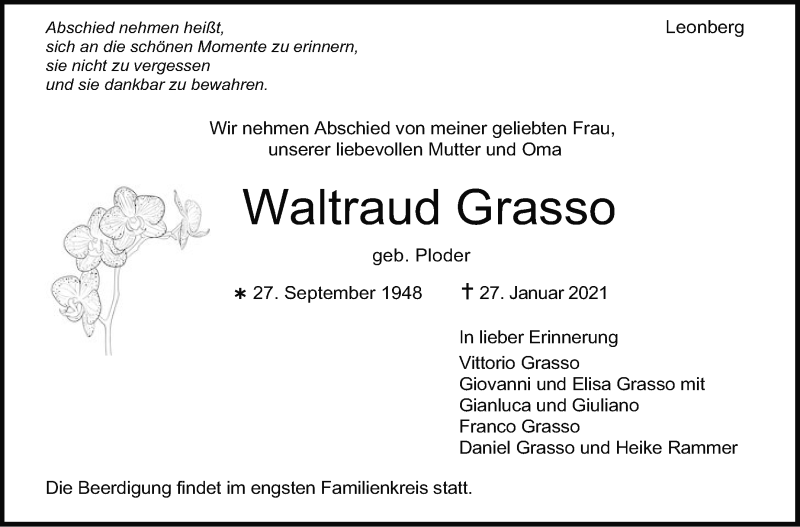 Hier finden Sie alle Traueranzeigen aus der Zeitung, die bisher für Waltraud Grasso erschienen sind. Weitere Traueranzeigen, die in der Zeitung erscheinen, werden hier ebenfalls aufgelistet