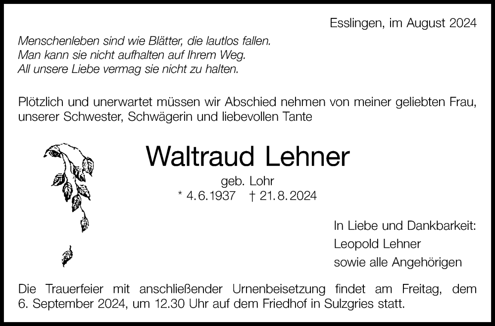 Hier finden Sie alle Traueranzeigen aus der Zeitung, die bisher für Waltraud Lehner erschienen sind. Weitere Traueranzeigen, die in der Zeitung erscheinen, werden hier ebenfalls aufgelistet