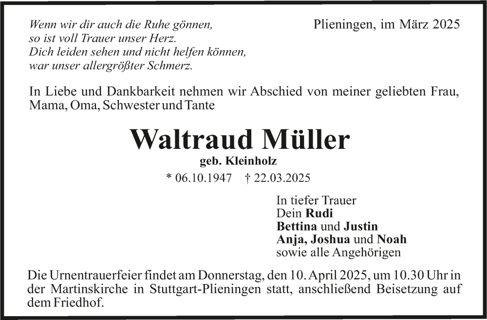 Hier finden Sie alle Traueranzeigen aus der Zeitung, die bisher für Waltraud Müller erschienen sind. Weitere Traueranzeigen, die in der Zeitung erscheinen, werden hier ebenfalls aufgelistet