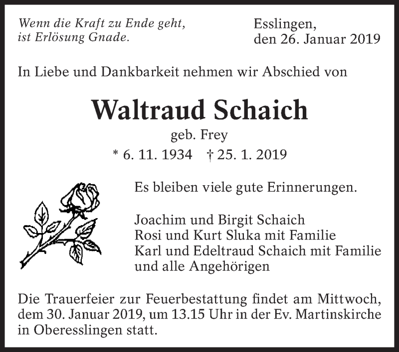 Hier finden Sie alle Traueranzeigen aus der Zeitung, die bisher für Waltraud Schaich erschienen sind. Weitere Traueranzeigen, die in der Zeitung erscheinen, werden hier ebenfalls aufgelistet