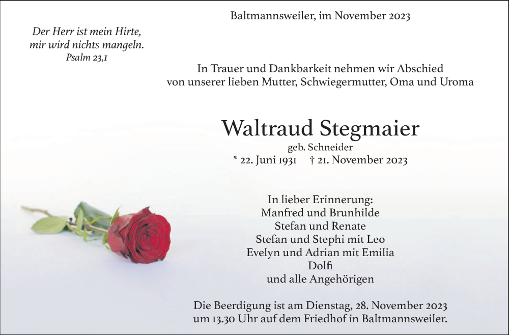 Hier finden Sie alle Traueranzeigen aus der Zeitung, die bisher für Waltraud Stegmaier erschienen sind. Weitere Traueranzeigen, die in der Zeitung erscheinen, werden hier ebenfalls aufgelistet