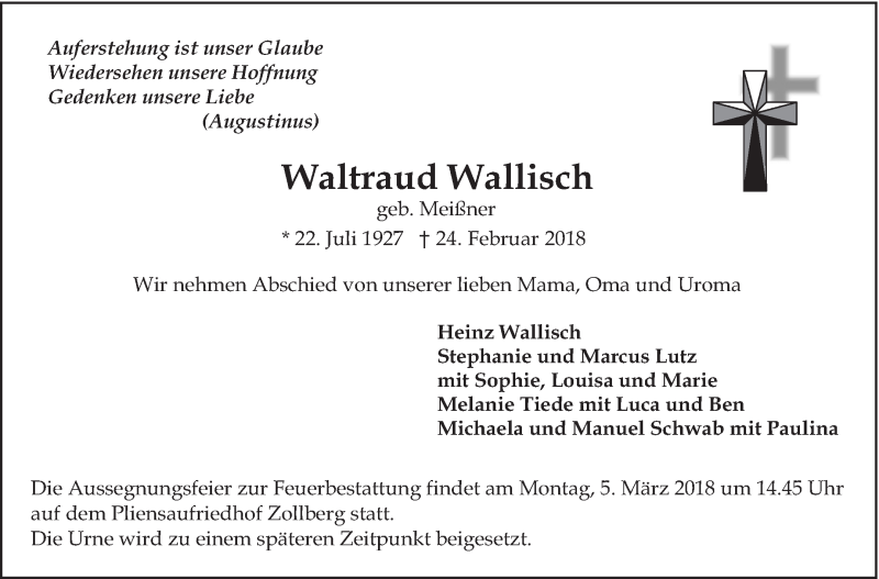 Hier finden Sie alle Traueranzeigen aus der Zeitung, die bisher für Waltraud Wallisch erschienen sind. Weitere Traueranzeigen, die in der Zeitung erscheinen, werden hier ebenfalls aufgelistet