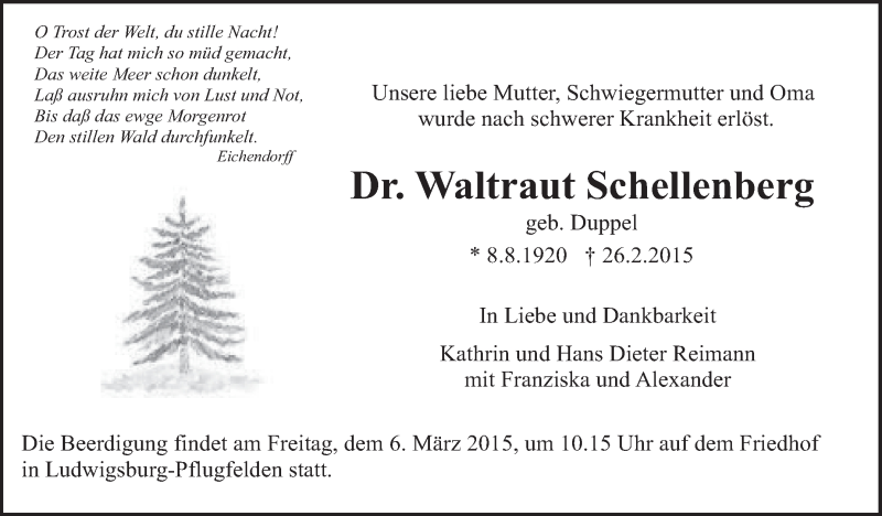 Hier finden Sie alle Traueranzeigen aus der Zeitung, die bisher für Waltraut Schellenberg erschienen sind. Weitere Traueranzeigen, die in der Zeitung erscheinen, werden hier ebenfalls aufgelistet