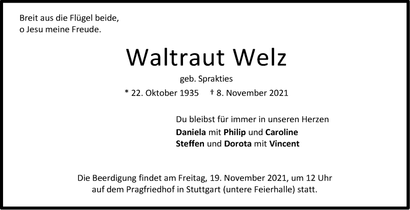 Hier finden Sie alle Traueranzeigen aus der Zeitung, die bisher für Waltraut Welz erschienen sind. Weitere Traueranzeigen, die in der Zeitung erscheinen, werden hier ebenfalls aufgelistet