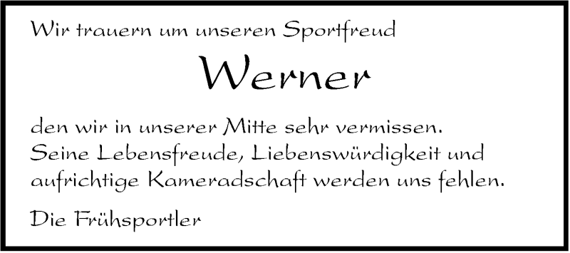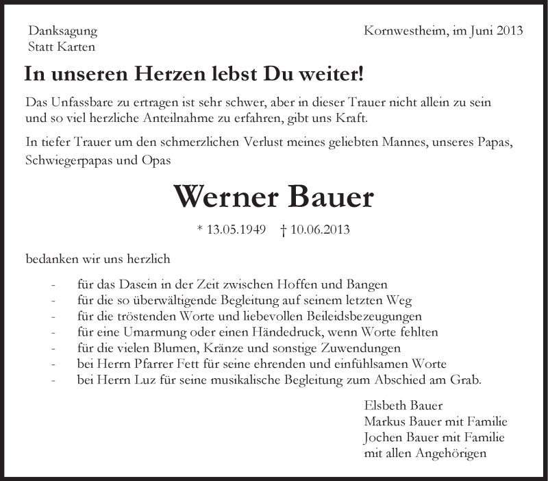 Hier finden Sie alle Traueranzeigen aus der Zeitung, die bisher für Werner Bauer erschienen sind. Weitere Traueranzeigen, die in der Zeitung erscheinen, werden hier ebenfalls aufgelistet