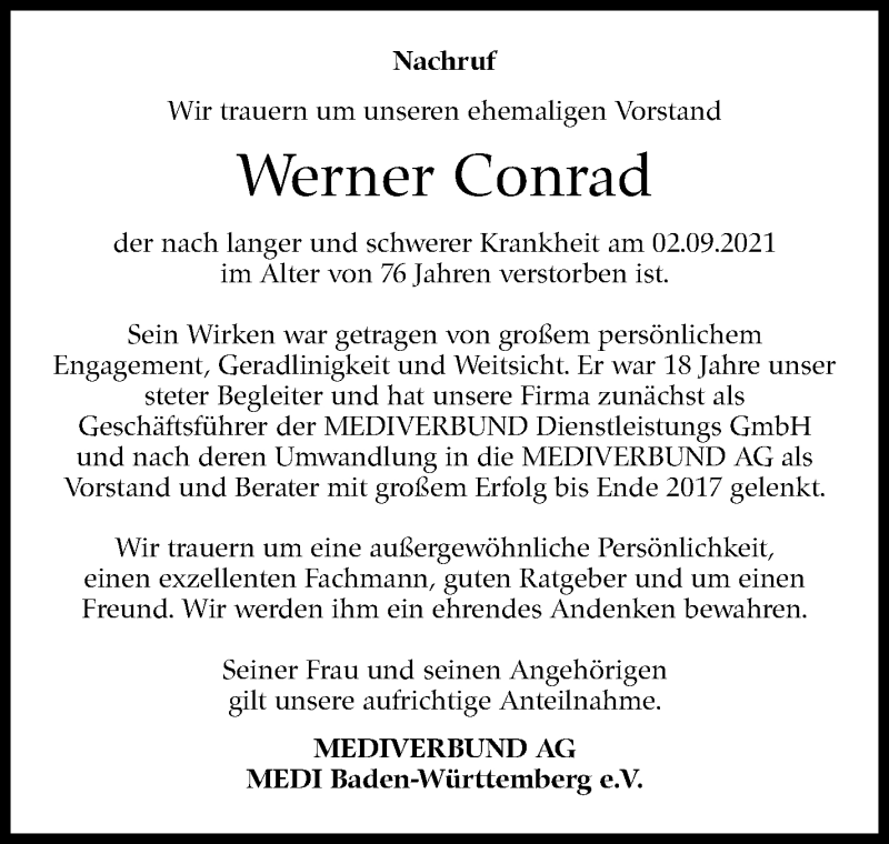 Hier finden Sie alle Traueranzeigen aus der Zeitung, die bisher für Werner Conrad erschienen sind. Weitere Traueranzeigen, die in der Zeitung erscheinen, werden hier ebenfalls aufgelistet