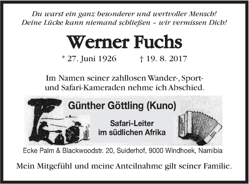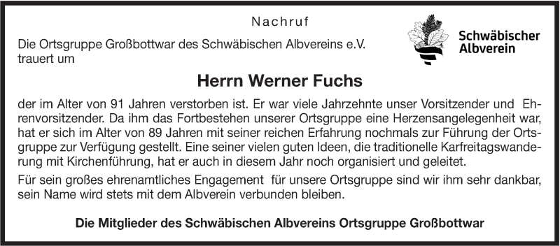 Hier finden Sie alle Traueranzeigen aus der Zeitung, die bisher für Werner Fuchs erschienen sind. Weitere Traueranzeigen, die in der Zeitung erscheinen, werden hier ebenfalls aufgelistet