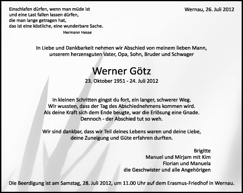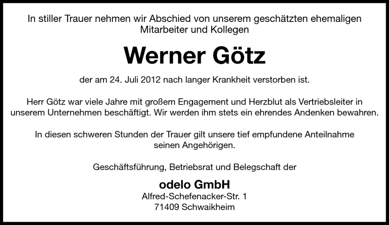 Hier finden Sie alle Traueranzeigen aus der Zeitung, die bisher für Werner Götz erschienen sind. Weitere Traueranzeigen, die in der Zeitung erscheinen, werden hier ebenfalls aufgelistet