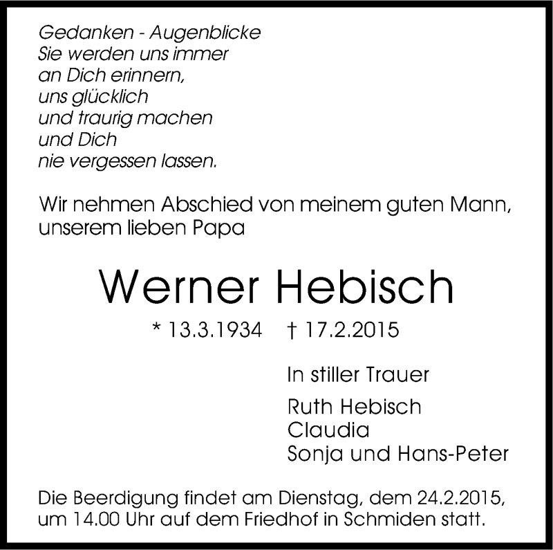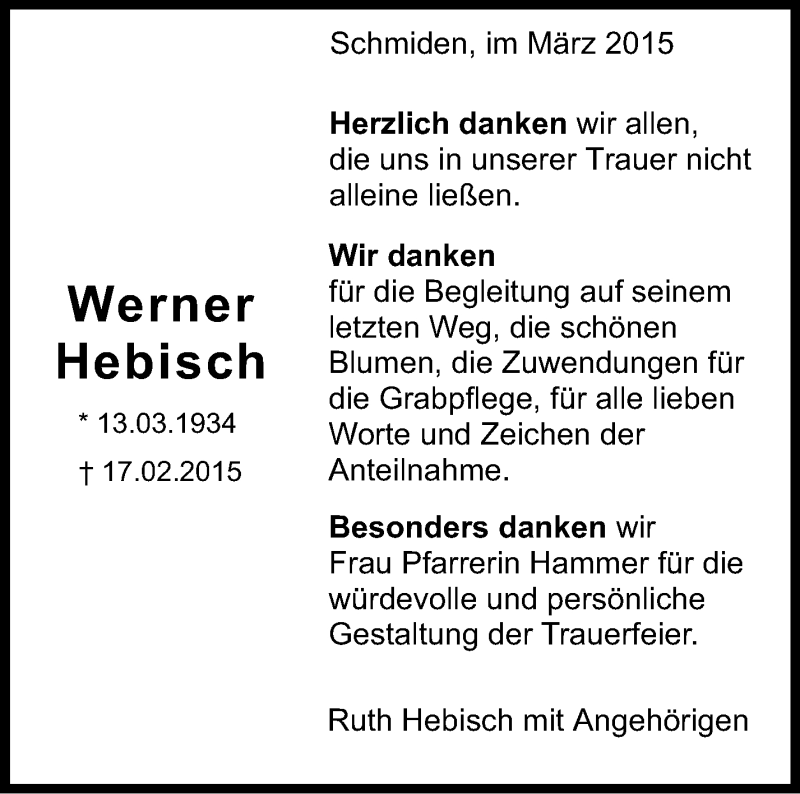 Hier finden Sie alle Traueranzeigen aus der Zeitung, die bisher für Werner Hebisch erschienen sind. Weitere Traueranzeigen, die in der Zeitung erscheinen, werden hier ebenfalls aufgelistet