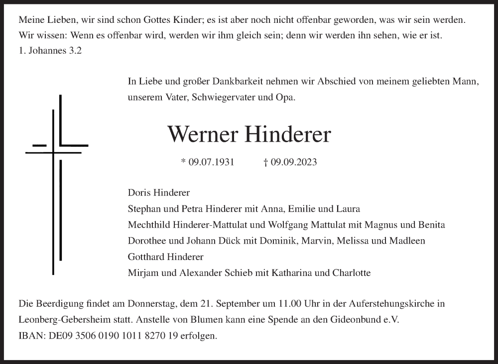 Hier finden Sie alle Traueranzeigen aus der Zeitung, die bisher für Werner Hinderer erschienen sind. Weitere Traueranzeigen, die in der Zeitung erscheinen, werden hier ebenfalls aufgelistet