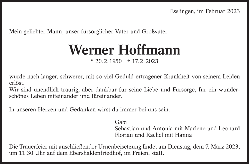 Hier finden Sie alle Traueranzeigen aus der Zeitung, die bisher für Werner Hoffmann erschienen sind. Weitere Traueranzeigen, die in der Zeitung erscheinen, werden hier ebenfalls aufgelistet