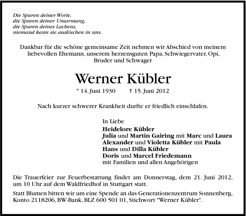 Hier finden Sie alle Traueranzeigen aus der Zeitung, die bisher für Werner Kübler erschienen sind. Weitere Traueranzeigen, die in der Zeitung erscheinen, werden hier ebenfalls aufgelistet