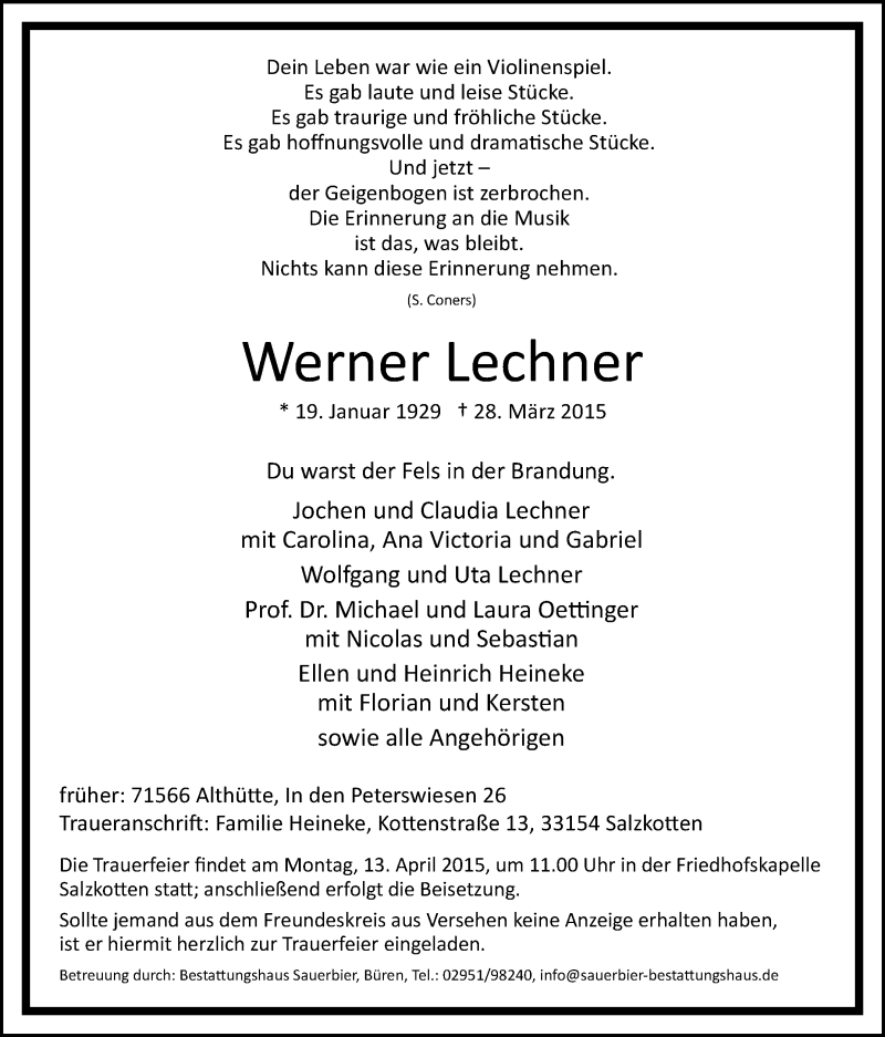 Hier finden Sie alle Traueranzeigen aus der Zeitung, die bisher für Werner Lechner erschienen sind. Weitere Traueranzeigen, die in der Zeitung erscheinen, werden hier ebenfalls aufgelistet