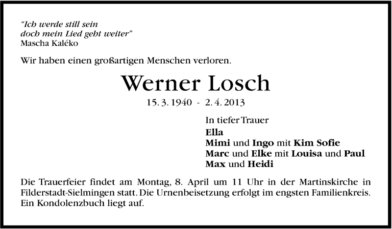 Hier finden Sie alle Traueranzeigen aus der Zeitung, die bisher für Werner Losch erschienen sind. Weitere Traueranzeigen, die in der Zeitung erscheinen, werden hier ebenfalls aufgelistet