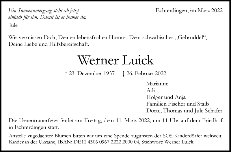 Hier finden Sie alle Traueranzeigen aus der Zeitung, die bisher für Werner Luick erschienen sind. Weitere Traueranzeigen, die in der Zeitung erscheinen, werden hier ebenfalls aufgelistet