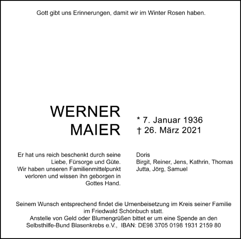 Hier finden Sie alle Traueranzeigen aus der Zeitung, die bisher für Werner Maier erschienen sind. Weitere Traueranzeigen, die in der Zeitung erscheinen, werden hier ebenfalls aufgelistet