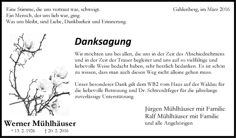 Hier finden Sie alle Traueranzeigen aus der Zeitung, die bisher für Werner Mühlhäuser erschienen sind. Weitere Traueranzeigen, die in der Zeitung erscheinen, werden hier ebenfalls aufgelistet