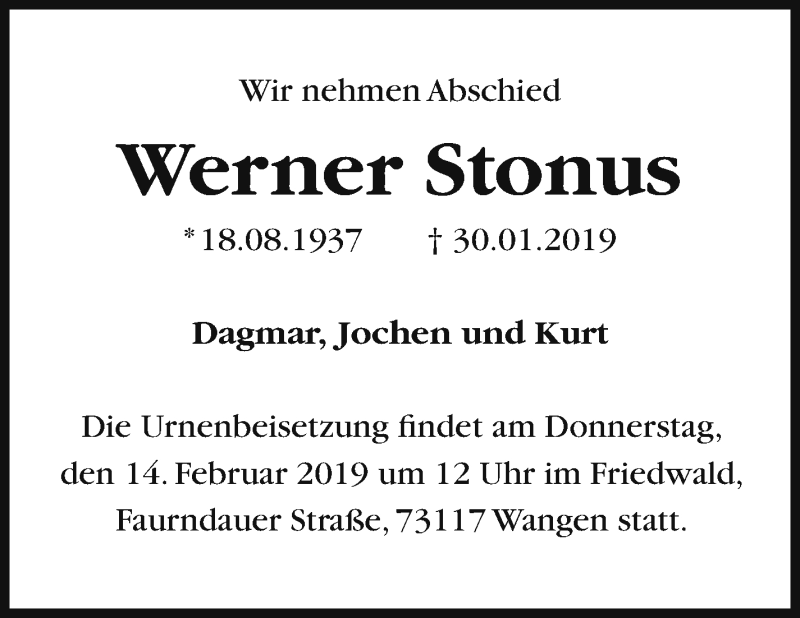 Hier finden Sie alle Traueranzeigen aus der Zeitung, die bisher für Werner Stonus erschienen sind. Weitere Traueranzeigen, die in der Zeitung erscheinen, werden hier ebenfalls aufgelistet