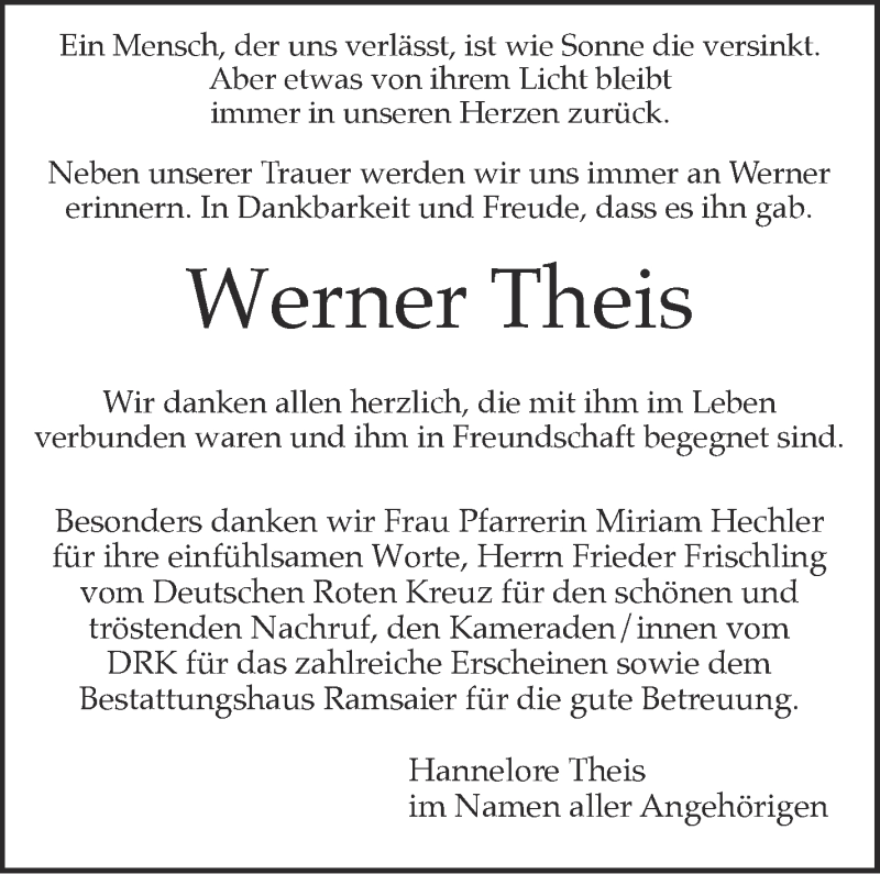 Hier finden Sie alle Traueranzeigen aus der Zeitung, die bisher für Werner Theis erschienen sind. Weitere Traueranzeigen, die in der Zeitung erscheinen, werden hier ebenfalls aufgelistet