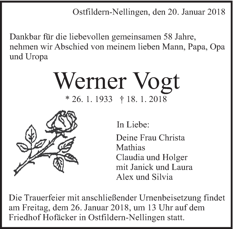 Hier finden Sie alle Traueranzeigen aus der Zeitung, die bisher für Werner Vogt erschienen sind. Weitere Traueranzeigen, die in der Zeitung erscheinen, werden hier ebenfalls aufgelistet