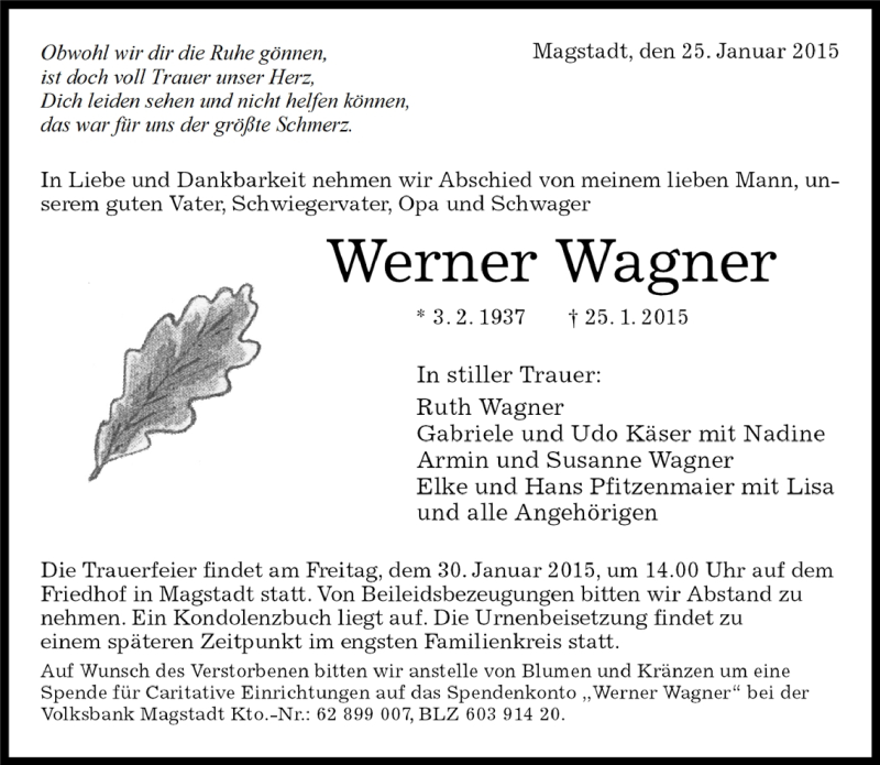 Hier finden Sie alle Traueranzeigen aus der Zeitung, die bisher für Werner Wagner erschienen sind. Weitere Traueranzeigen, die in der Zeitung erscheinen, werden hier ebenfalls aufgelistet