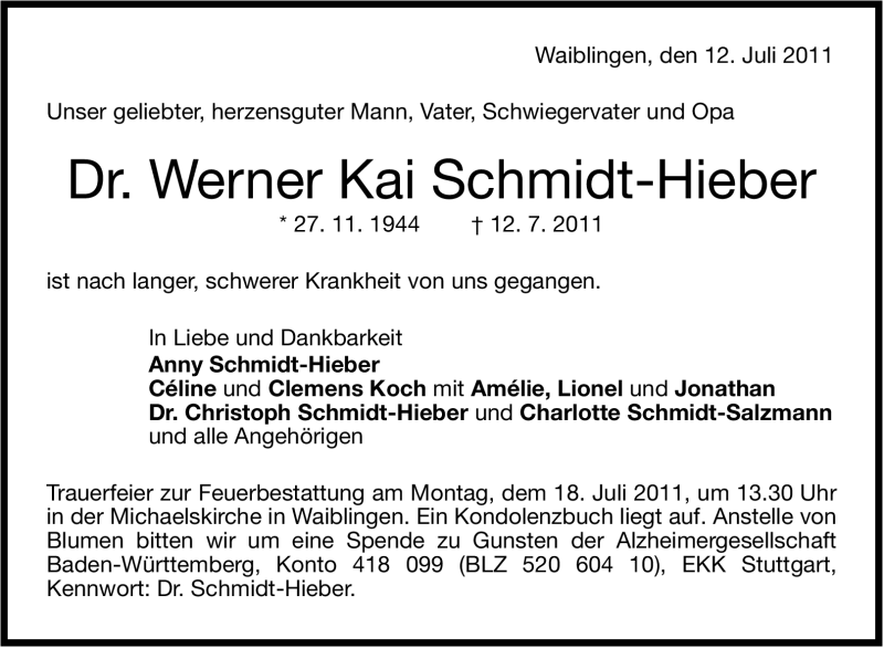 Hier finden Sie alle Traueranzeigen aus der Zeitung, die bisher für Werner Kai Schmidt-Hieber erschienen sind. Weitere Traueranzeigen, die in der Zeitung erscheinen, werden hier ebenfalls aufgelistet
