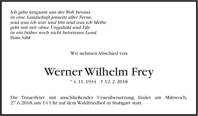 Hier finden Sie alle Traueranzeigen aus der Zeitung, die bisher für Werner Wilhelm Frey erschienen sind. Weitere Traueranzeigen, die in der Zeitung erscheinen, werden hier ebenfalls aufgelistet