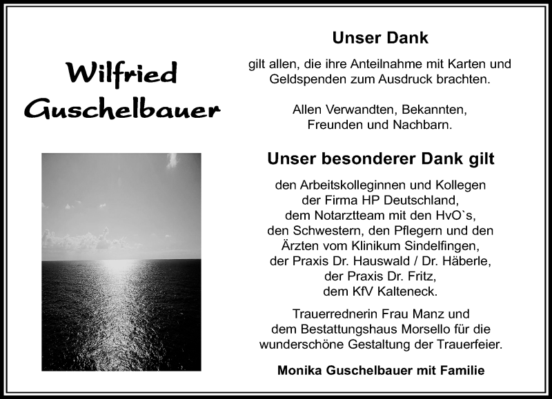 Hier finden Sie alle Traueranzeigen aus der Zeitung, die bisher für Wilfried Guschelbauer erschienen sind. Weitere Traueranzeigen, die in der Zeitung erscheinen, werden hier ebenfalls aufgelistet