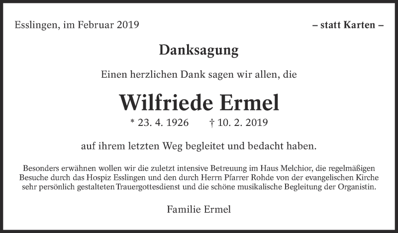 Hier finden Sie alle Traueranzeigen aus der Zeitung, die bisher für Wilfriede Ermel erschienen sind. Weitere Traueranzeigen, die in der Zeitung erscheinen, werden hier ebenfalls aufgelistet