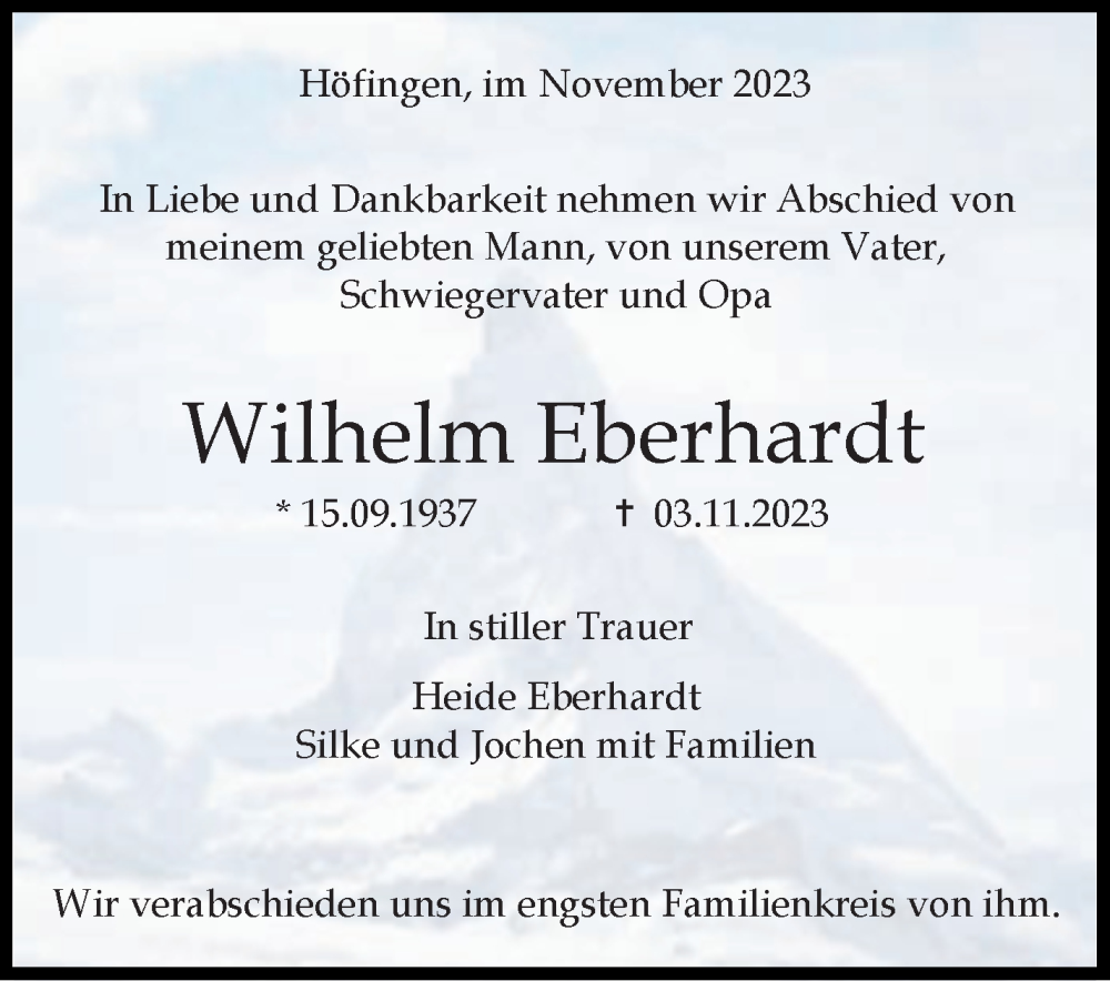 Hier finden Sie alle Traueranzeigen aus der Zeitung, die bisher für Wilhelm Eberhardt erschienen sind. Weitere Traueranzeigen, die in der Zeitung erscheinen, werden hier ebenfalls aufgelistet