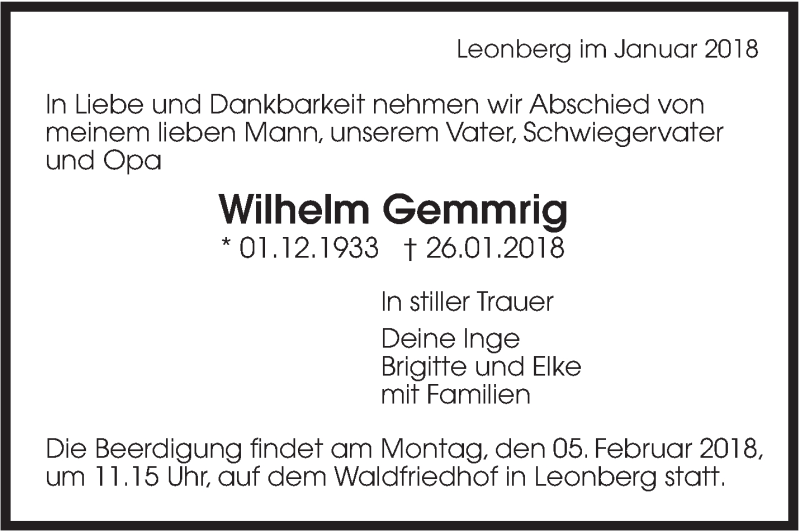 Hier finden Sie alle Traueranzeigen aus der Zeitung, die bisher für Wilhelm Gemmrig erschienen sind. Weitere Traueranzeigen, die in der Zeitung erscheinen, werden hier ebenfalls aufgelistet
