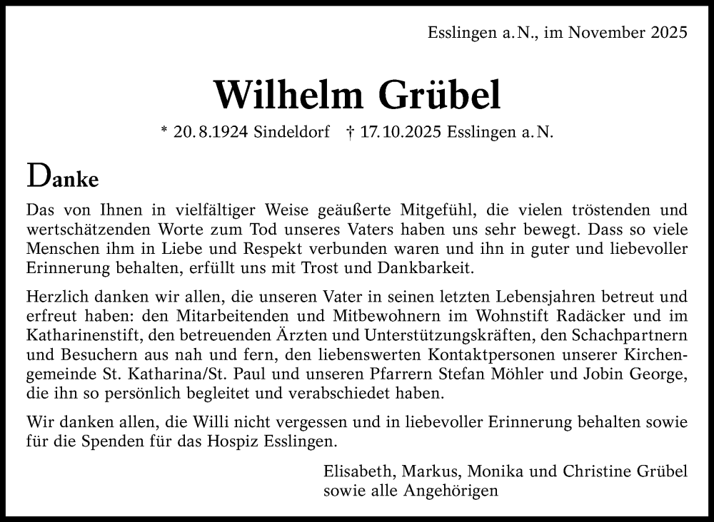 Hier finden Sie alle Traueranzeigen aus der Zeitung, die bisher für Wilhelm Grübel erschienen sind. Weitere Traueranzeigen, die in der Zeitung erscheinen, werden hier ebenfalls aufgelistet
