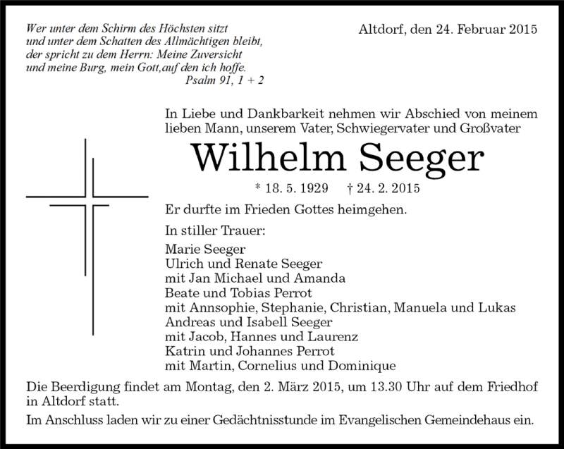 Hier finden Sie alle Traueranzeigen aus der Zeitung, die bisher für Wilhelm Seeger erschienen sind. Weitere Traueranzeigen, die in der Zeitung erscheinen, werden hier ebenfalls aufgelistet