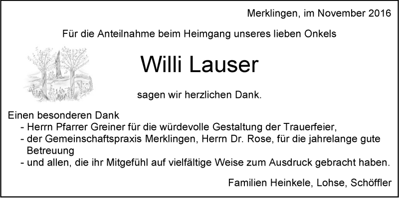 Hier finden Sie alle Traueranzeigen aus der Zeitung, die bisher für Wili Lauser erschienen sind. Weitere Traueranzeigen, die in der Zeitung erscheinen, werden hier ebenfalls aufgelistet