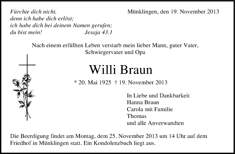 Hier finden Sie alle Traueranzeigen aus der Zeitung, die bisher für Willi Braun erschienen sind. Weitere Traueranzeigen, die in der Zeitung erscheinen, werden hier ebenfalls aufgelistet