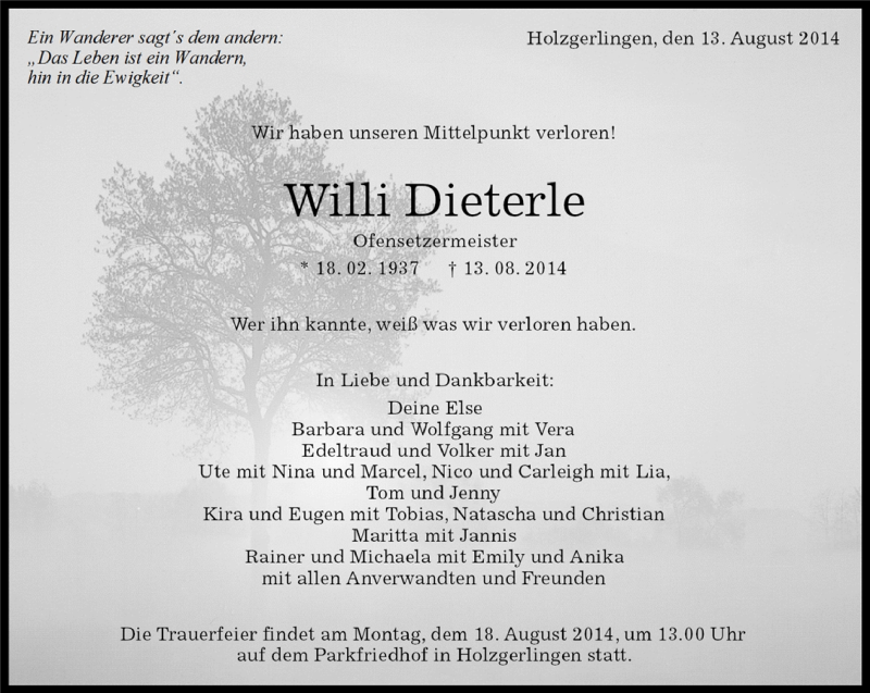 Hier finden Sie alle Traueranzeigen aus der Zeitung, die bisher für Willi Dieterle erschienen sind. Weitere Traueranzeigen, die in der Zeitung erscheinen, werden hier ebenfalls aufgelistet