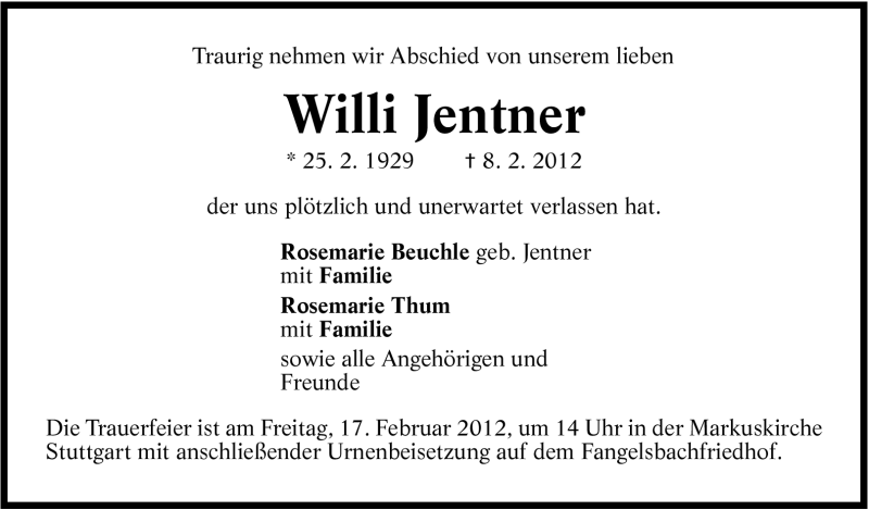 Hier finden Sie alle Traueranzeigen aus der Zeitung, die bisher für Willi Jentner erschienen sind. Weitere Traueranzeigen, die in der Zeitung erscheinen, werden hier ebenfalls aufgelistet