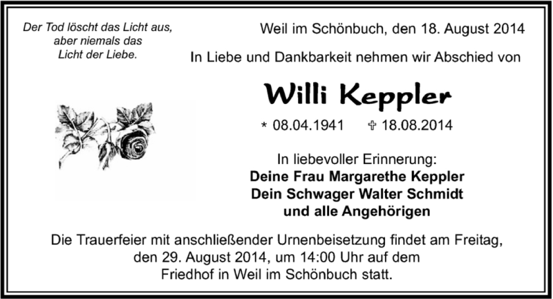 Hier finden Sie alle Traueranzeigen aus der Zeitung, die bisher für Willi Keppler erschienen sind. Weitere Traueranzeigen, die in der Zeitung erscheinen, werden hier ebenfalls aufgelistet