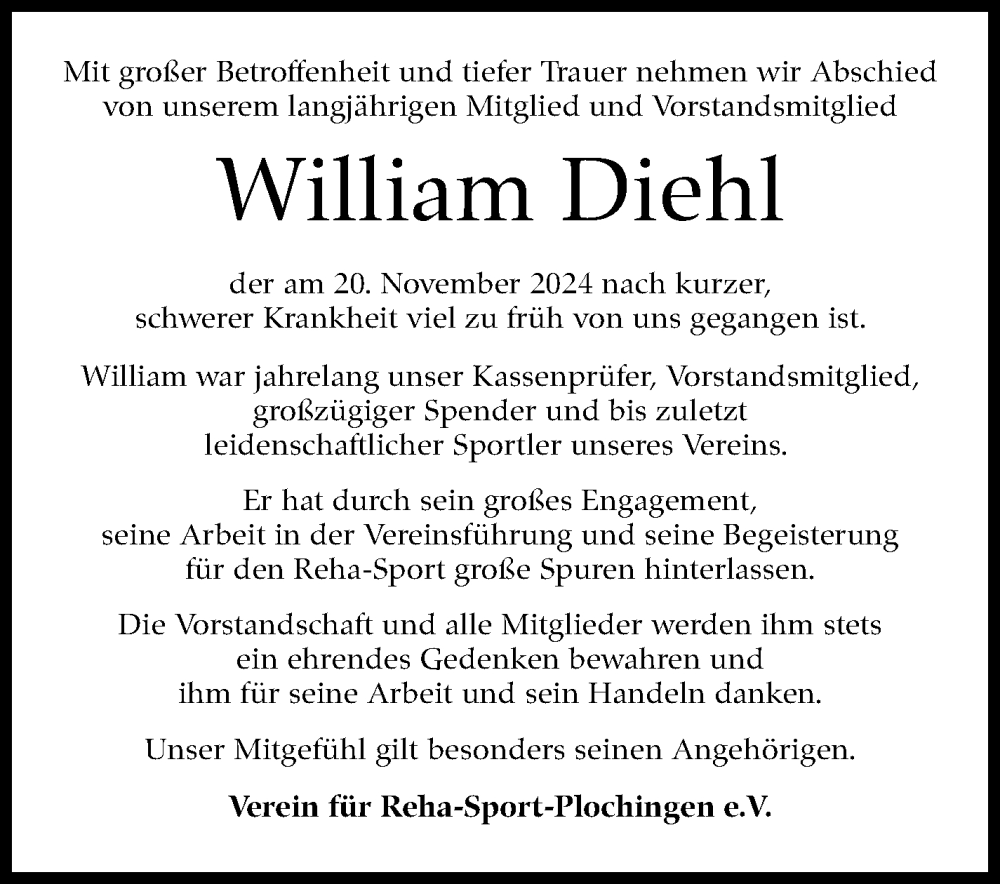 Hier finden Sie alle Traueranzeigen aus der Zeitung, die bisher für William Diehl erschienen sind. Weitere Traueranzeigen, die in der Zeitung erscheinen, werden hier ebenfalls aufgelistet