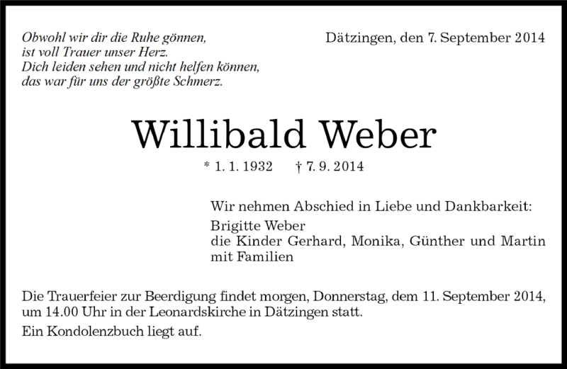 Hier finden Sie alle Traueranzeigen aus der Zeitung, die bisher für Willibald Weber erschienen sind. Weitere Traueranzeigen, die in der Zeitung erscheinen, werden hier ebenfalls aufgelistet
