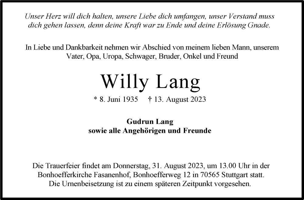 Hier finden Sie alle Traueranzeigen aus der Zeitung, die bisher für Willy Lang erschienen sind. Weitere Traueranzeigen, die in der Zeitung erscheinen, werden hier ebenfalls aufgelistet
